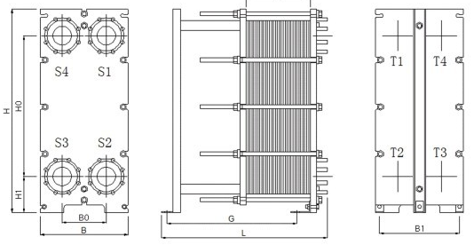 结构:板式换热器主要由框架和板片两大部分组成。板片由各种材料的制成的薄板用各种不同形式的磨具压成形状各异的波纹,并在板片的四个角上开有角孔,用于介质的流道。